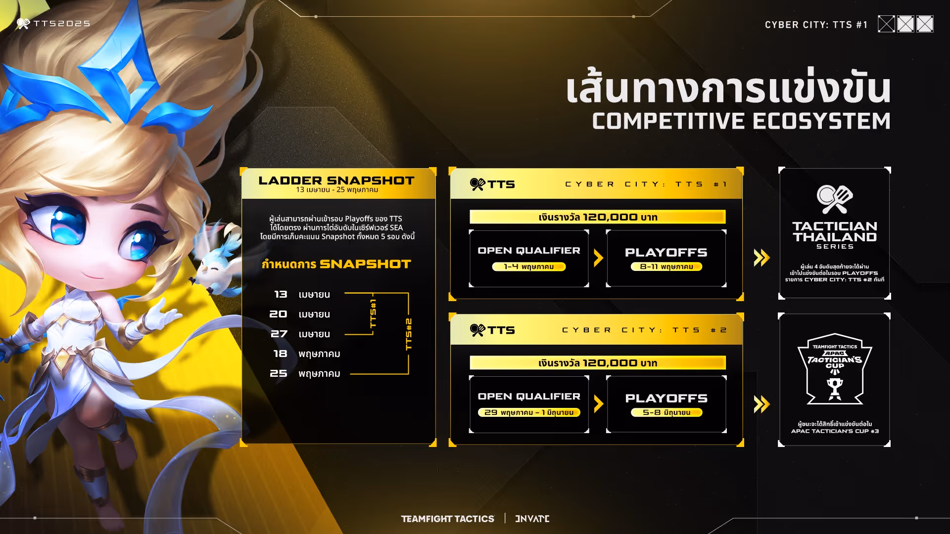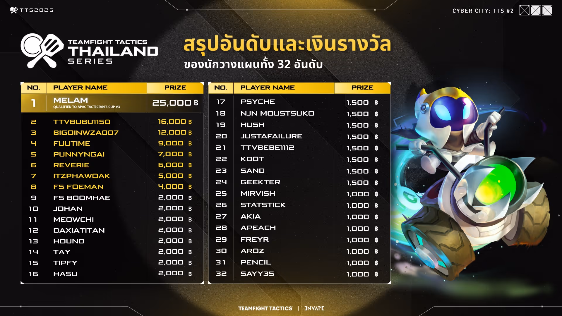 สรุปอันดับนักวางแผน 32 คนที่ผ่านเข้าสู่รอบเพลย์ออฟ ชิงตั๋วสู่รอบ 24 คนสุดท้าย! Cyber City: TTS #2 การแข่งขัน Teamfight Tactics เซต 14 อย่างเป็นทางการจาก Riot Games ประเทศไทย พร้อมเงินรางวัลรวม 120,000 บาท!